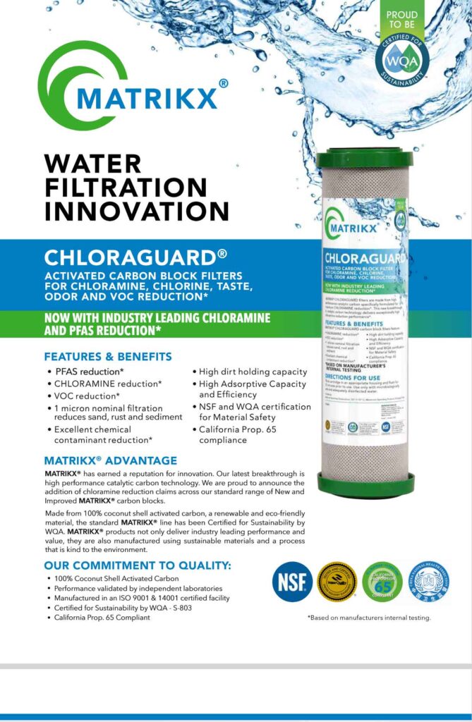 - 1 x 1- Micron USA Matrikx Chloroguard Chloramine / PFAS reduction cartridge