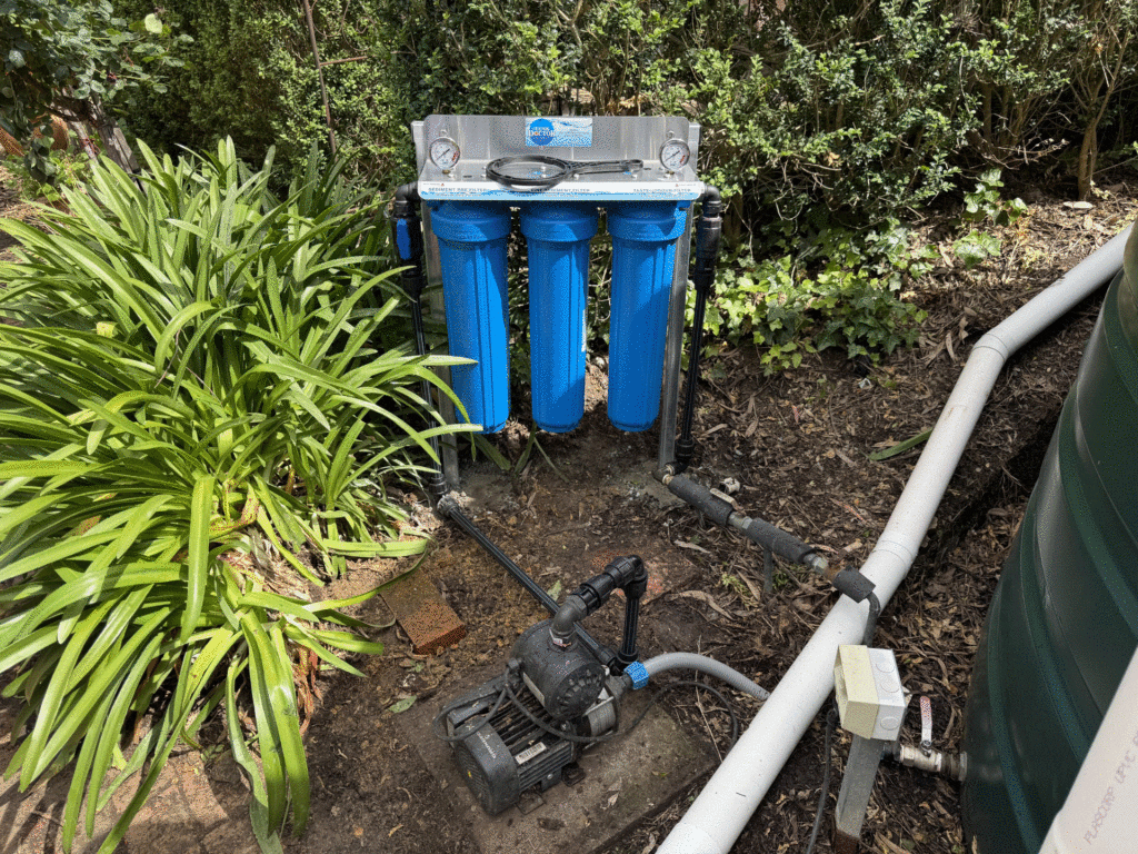 Triple 20″ x 4.5″ Whole House Rainwater Filter Systems remove unwanted sediment through a 10-micron polyester pleated cartridge, followed by a 5-micron poly spun cartridge to remove finer silt particles before filtering through a 5-micron silver impregnated carbon cartridge to remove colour, taste and odour. Silver is used to inhibit the growth of bacteria on the cartridge. The spun cartridge helps extend the workable life of the carbon cartridge. Pressure gauges indicate water inlet and outlet pressure.