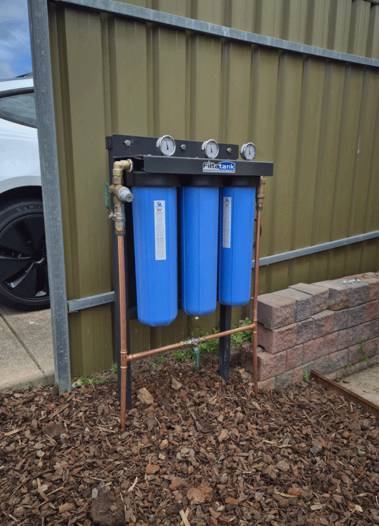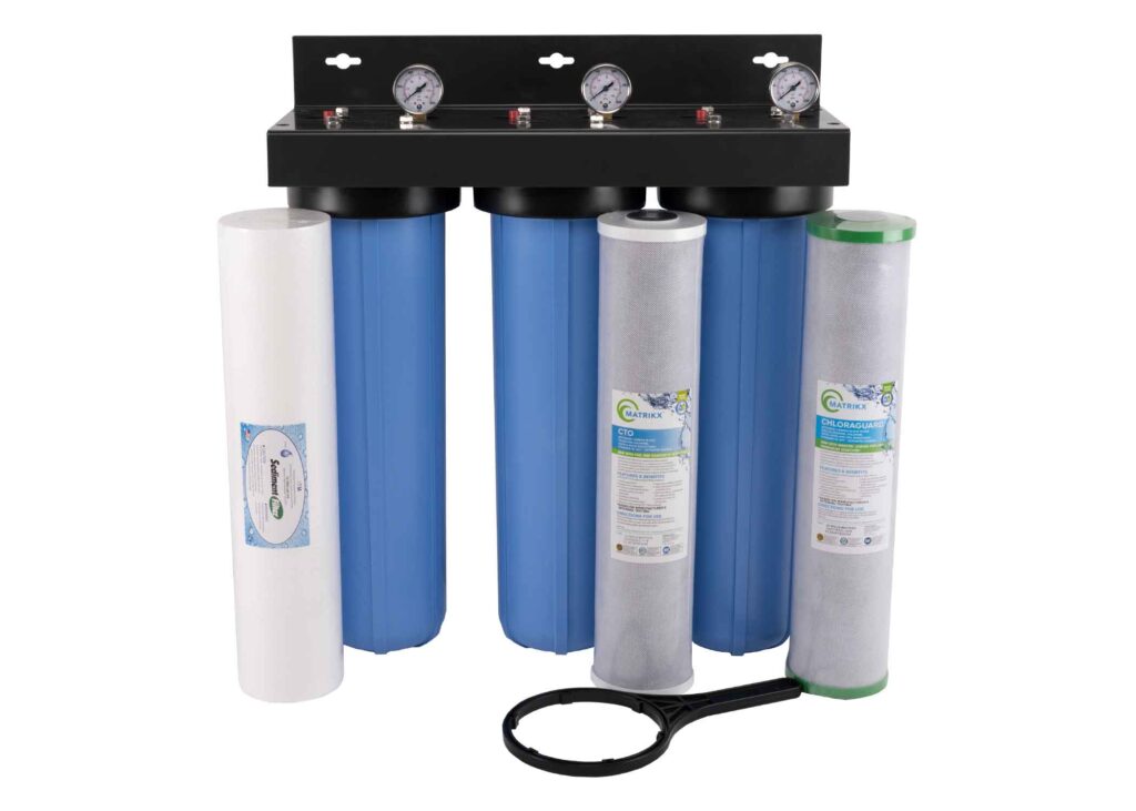 Simply the best value whole house mains water filtration system on the market with triple Pentair 20″ x 4.5″ USA filter housings and quality Australian made casing. The system incorporates market leading Matrix filter cartridges designed to reduce silt, rust, chlorine, chloramines and more from your mains water supply.